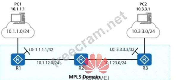 Comprehensive and Detailed In-Depth Explanation: This question is based on MPLS (Multiprotocol Label Switching) and its interaction with routing protocols . The goal is to ensure PC1 (10.1.1.1) can communicate with PC2 (10.3.3.1) over MPLS. Let's analyze each option carefully. 1## Understanding MPLS Routing Requirements To forward traffic using MPLS and LDP, we need: * An IGP (Interior Gateway Protocol) like OSPF or IS-IS to advertise network reachability. * Loopback interfaces advertised in OSPF to establish LDP neighbor relationships. * Consistent MPLS LDP enablement on all links in the MPLS domain. * End-to-end IP reachability between loopbacks (since LDP uses the loopback for label distribution). 2## Option A (Correct Answer) Analysis This configuration enables OSPF on all routers (R1, R2, and R3) across the MPLS domain: # All networks are advertised in OSPF area 0, ensuring IP reachability.# Loopback interfaces (1.1.1.1, 2.2.2.2, 3.3.3.3) are included, which is required for MPLS LDP peer establishment.# PC1's network (10.1.1.0/24) and PC2's network (10.3.3.0/24) are properly advertised, ensuring end-to-end connectivity.# R1, R2, and R3 have OSPF neighbor relationships, meaning LDP can use OSPF routes for label switching. # Conclusion: Option A meets all MPLS forwarding requirements and is the correct answer. 3## Why Other Options Are Incorrect # Option B (Incorrect) * Uses BGP instead of OSPF, which is not optimal for MPLS forwarding in a simple MPLS domain. * LDP requires an IGP like OSPF or IS-IS to work efficiently. * BGP alone does not establish LDP label bindings between R1, R2, and R3. # Option C (Incorrect) * Mixes OSPF and BGP, causing routing inconsistency. * Uses ip ip-prefix and recursive lookup, which is unnecessary in a standard MPLS domain. * BGP does not distribute labels dynamically like an IGP with LDP. # Option D (Incorrect) * R1 does not advertise the 10.1.1.0/24 network, meaning PC1's network is not reachable. * R3 does not advertise the 10.3.3.0/24 network, meaning PC2's network is not reachable. * Missing essential routing entries for full end-to-end reachability. References: # HCIP-Datacom Advanced Routing & Switching Technology# Huawei Official MPLS and LDP Configuration Guide# Huawei Enterprise Networking Documentation