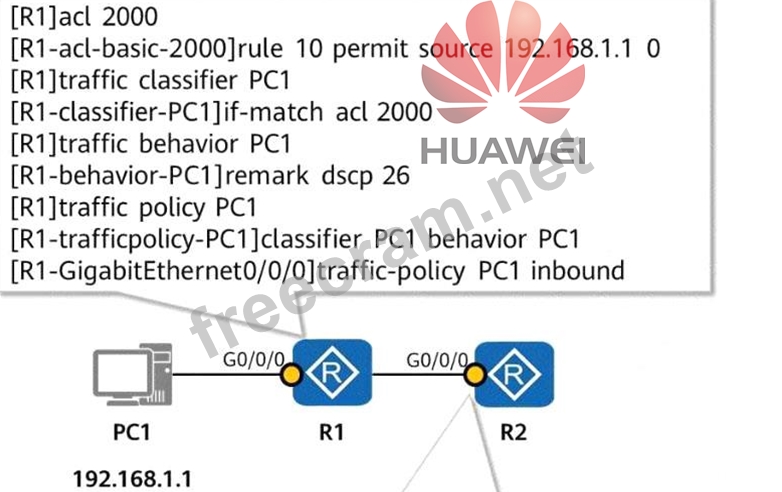 Refer to the configuration in the figure. Which queue on R2 do packets of PC1 enter by default?