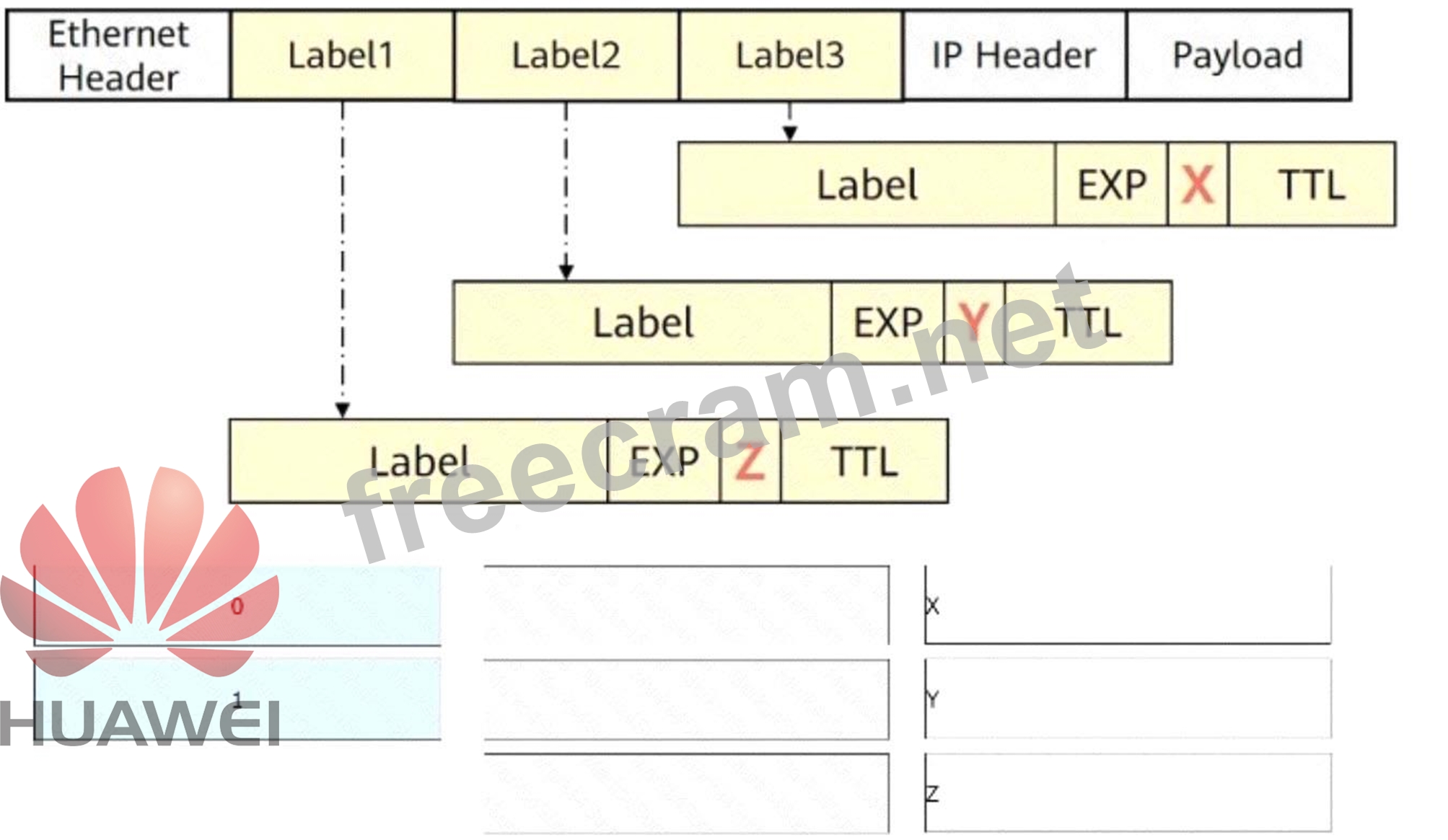 # X = 0 (Default EXP for Label 1, the top label in the stack).# Y = 0 (EXP for Label 2, unchanged from the default value).# Z = 1 (EXP for Label 3, indicating a QoS setting applied to the bottom label).