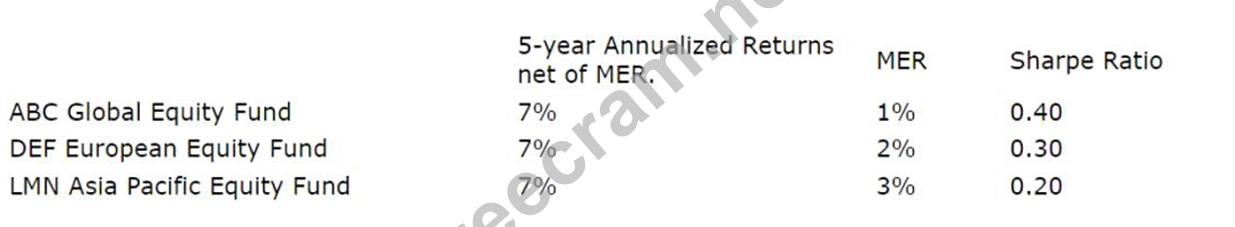 Explanation Adele has a high-risk profile and an excellent understanding of equities. Therefore, it would be appropriate for Danny to recommend growth funds. However, since Adele has $1,000,000 to invest, it would be prudent to diversify her investments and invest equally in all 3 funds. This way, she can benefit from the exposure to different regions and sectors, and reduce the impact of market fluctuations on her portfolio. Based on the table, all 3 funds have the same 5-year annualized returns net of MER, which is 15%. However, they have different MERs and Sharpe ratios. The MER is the fee charged by the fund manager for managing the fund, and the Sharpe ratio is a measure of risk-adjusted return. A lower MER means a lower cost for the investor, and a higher Sharpe ratio means a higher return per unit of risk. Therefore, investing equally in all 3 funds would allow Adele to achieve a balanced trade-off between cost and performance. References: * Canadian Investment Funds Course (CIFC) Study Guide, Chapter 4: Mutual Funds, Section 4.2: Types of Mutual Funds, page 4-6 * Canadian Investment Funds Course (CIFC) Study Guide, Chapter 5: Fixed-Income Securities, Section 5.5: Risk-Return Trade-Offs, page 5-14 * Sharpe Ratio Definition - Investopedia
