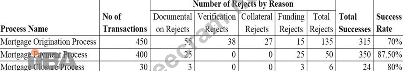 A financial institution engaged in mortgage lending has embarked on a business process improvement initiative to eliminate the activities that hinder growth to ultimately improve the success rate of its mortgage business. As a benchmark for identification, the institution is keen on improving any business process that has less than a 75% success rate. The institution has appointed a business analyst (BA) to review the business transactions for the processes of origination, payments, and closures, as well as identify opportunities for improvements and recommend solutions.