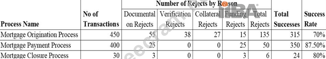* Each business process has a certain number of rejects and the reasons for rejection include documentation, verification, collateral, and funding. Funding rejects occur when the bank's customers have failed to make payment of their mortgage processing fee or mortgage closure payment.