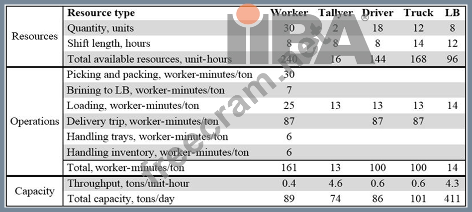 A business analyst (BA) has spent several days observing and measuring the warehouse activities to understand the situation and to gain insights into possible solutions. The delivery workflow is a four-step process: (1) picking the orders and assembling them on trays, (2) bringing the trays to the loading bay, (3) loading the orders into trucks, and (4) delivering the orders to customers. As the following table illustrates, overall performance depends is dependent on five major resources: (1) the workers who pick the orders and load them into trucks, (2) the tallyers who check the orders, (3) the drivers, (4) the trucks, and (5) eight loading bays (LBs).