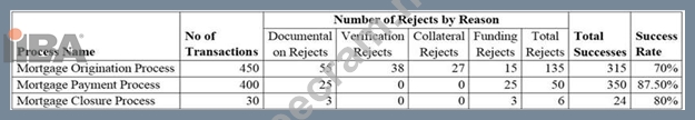 * Each business process has a certain number of rejects and the reasons for rejection include documentation, verification, collateral, and funding. Funding rejects occur when the bank's customers have failed to make payment of their mortgage processing fee or mortgage closure payment.