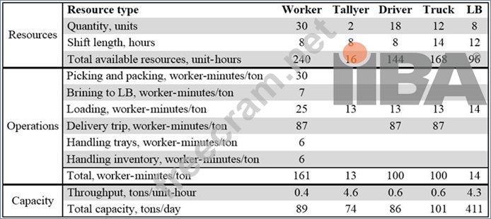 A business analyst (BA) has spent several days observing and measuring the warehouse activities to understand the situation and to gain insights into possible solutions. The delivery workflow is a four-step process: (1) picking the orders and assembling them on trays, (2) bringing the trays to the loading bay, (3) loading the orders into trucks, and (4) delivering the orders to customers. As the following table illustrates, overall performance depends is dependent on five major resources: (1) the workers who pick the orders and load them into trucks, (2) the tallyers who check the orders, (3) the drivers, (4) the trucks, and (5) eight loading bays (LBs).