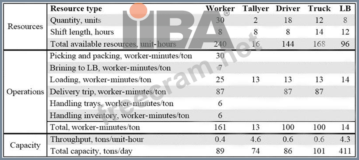 A business analyst (BA) has spent several days observing and measuring the warehouse activities to understand the situation and to gain insights into possible solutions. The delivery workflow is a four-step process: (1) picking the orders and assembling them on trays, (2) bringing the trays to the loading bay, (3) loading the orders into trucks, and (4) delivering the orders to customers. As the following table illustrates, overall performance depends is dependent on five major resources: (1) the workers who pick the orders and load them into trucks, (2) the tallyers who check the orders, (3) the drivers, (4) the trucks, and (5) eight loading bays (LBs).