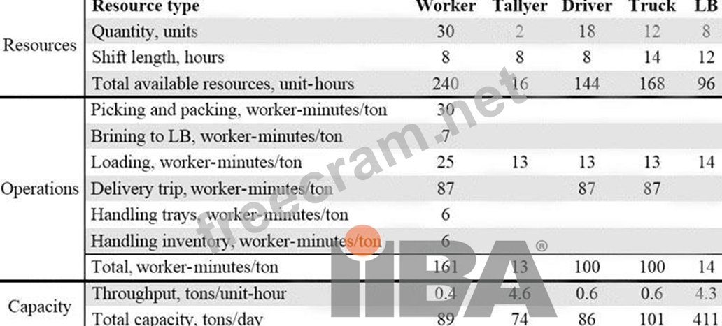 A business analyst (BA) has spent several days observing and measuring the warehouse activities to understand the situation and to gain insights into possible solutions. The delivery workflow is a four-step process: (1) picking the orders and assembling them on trays, (2) bringing the trays to the loading bay, (3) loading the orders into trucks, and (4) delivering the orders to customers. As the following table illustrates, overall performance depends is dependent on five major resources: (1) the workers who pick the orders and load them into trucks, (2) the tallyers who check the orders, (3) the drivers, (4) the trucks, and (5) eight loading bays (LBs).