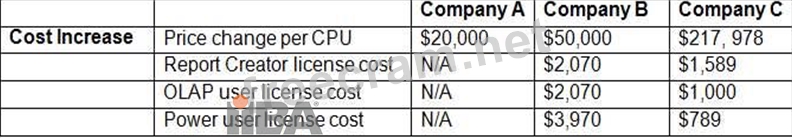 Scenario 1: Ten extra report creator, 1 extra OLAP user and 1 extra power user licenses and 2 extra CPU licenses Scenario 2: Twenty five extra report creator, 1 extra OLAP user and 1 extra power user licenses and 3 extra CPU licenses