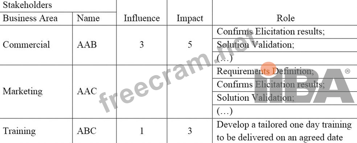 Explanation The marketing department (AAC) is a key stakeholder for launching an existing product in another channel, as they are responsible for defining the requirements, confirming the elicitation results, and validating the solution. Therefore, they have a high influence on the project, as they can affect the decisions and outcomes of the project. They also have a high impact from the project, as they will be directly affected by the changes and benefits of the new channel. According to the stakeholder analysis technique, influence and impact are two dimensions that can be used to categorize and prioritize stakeholders12. A stakeholder with high influence and high impact is considered a primary stakeholder, who should be actively involved and engaged throughout the project