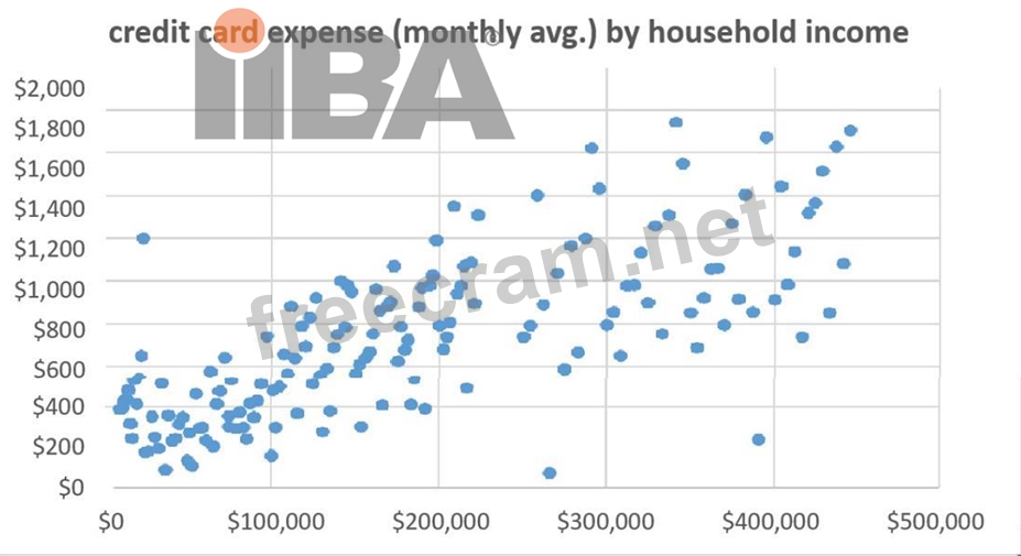 Explanation According to the Business Data Analytics (IIBA®- CBDA) principles, extreme outliers in a dataset can be identified visually on a scatter plot as points that are distinctly separate from the bulk of the data. In this visual, there are three points that are significantly higher on the y-axis (credit card expense) relative to their position on the x-axis (household income), indicating unusual credit card purchases. References: The identification and interpretation of outliers is a standard practice in data analytics and is covered under the Business Data Analytics (IIBA®- CBDA) learning resources.