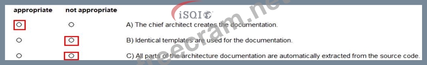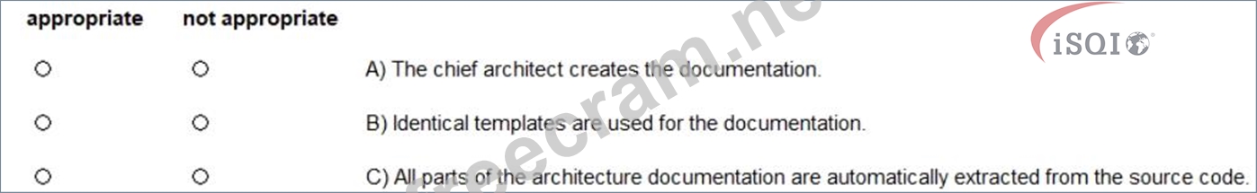 In your project, three architects and seven developers are working on the documentation of the software architecture. Which methods are appropriate in order to achieve a consistent and adequate documentation, and which are not? (Assign all answers.)