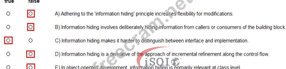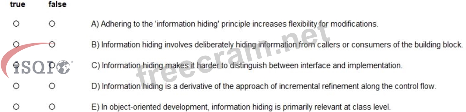 Which of the following statements regarding the design principle 'information hiding' are true and which are false? (Assign all answers.)