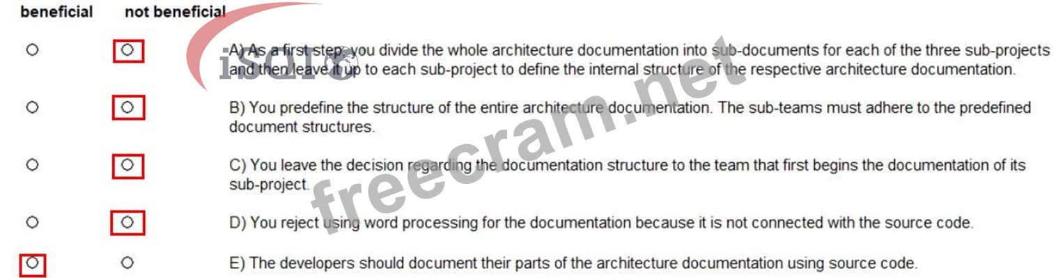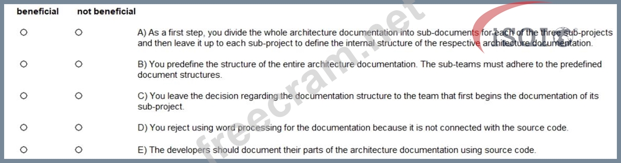 You are responsible for the documentation of the software architecture of a large development project. The project consists of three teams, each with its own architect, but with you as the person having overall responsibility of the entire project's software architecture. Which of the following measures are beneficial? (Assign all answers.)