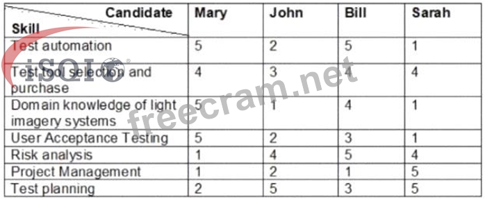 RISK1 Working prototypes will be delivered late to the integration test environments RISK 2 A delay in signing the contract with 'Silver Sound Ltd' will impact the programme schedule RISK 3 Inexperience in testing light imagery software will cause major defects to be missed RISK 4 The user interface software for the sound systems will be delivered late into testing Refer to SCENARIO 2 - The IT Director for 'Safe as Houses' is recruiting a Programme Test Manager and has been provided with a skills matrix for four prospective candidates. The matrix shows the skill level (5 being highest. 1 lowest) for each candidate: