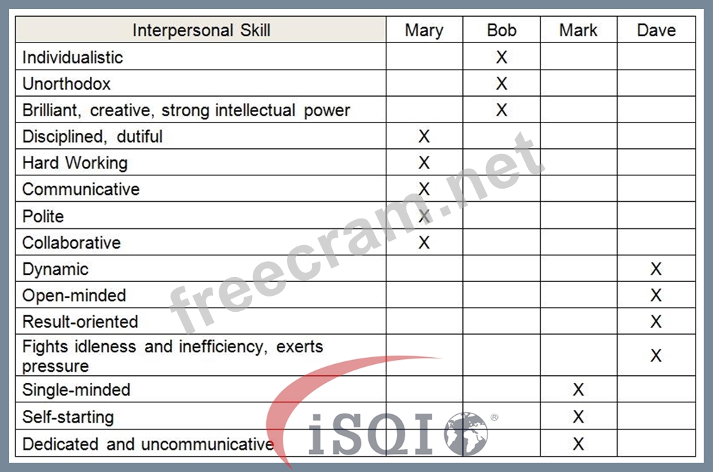 Your test team consists of four members (Mary, Bob, Mark, Dave) with different interpersonal skills.