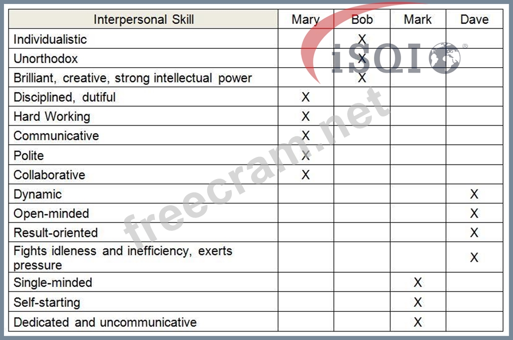 Your test team consists of four members (Mary, Bob, Mark, Dave) with different interpersonal skills.