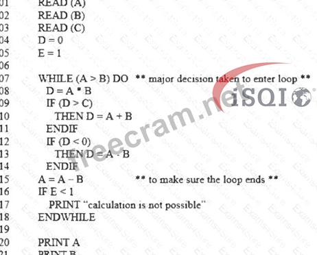 The code provided contains a potential endless loop. The loop is conditioned on the variable 'E' being less than 1 (IF E < 1), but within the loop, there is no operation that modifies the value of 'E'. Therefore, once the loop is entered, if the condition A > B holds true, the value of 'E' remains unchanged, leading to an endless loop situation. The decrement of 'A' in line 15 does not guarantee an exit condition for the loop, as it does not affect the value of 'E'. This is a control flow defect that could cause the program to hang or crash.