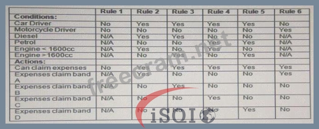 According to the decision table, Test Case 1 is valid because an employee who is not a car or motorcycle driver cannot claim expenses, as shown in Rule 1. Test Case 3 is valid because a motorcycle driver can claim expenses, as indicated in Rule 2, with expenses claim band A. However, Test Case 2 is invalid because, according to Rule 5, a car driver with a diesel engine greater than 1600cc cannot claim expenses. The expected result should be that the expense claim is not allowed, not band C.