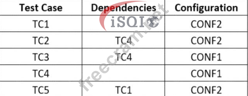 For each test case to be executed, the following table specifies its dependencies and the required configuration of the test environment for running such test case: Assume that CONF1 is the initial configuration of the test environment. Based on this assumption, which of the following is a test execution schedule that is compatible with the specified dependencies and allows minimizing the number of switches between the different configurations of the test environment?