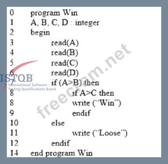 The pseudo-code provided for the "Win" program reads in variables A, B, C, and D. However, only variables A, B, and C are used in the conditional statements to determine if the output will be "Win" or "Loose". Variable 'D' is never used after it is read, which is a classic example of a 'defined but not used' data flow anomaly. This means that while there is an instruction to read a value into variable 'D', there is no subsequent use of this variable in the program's logic or output.
