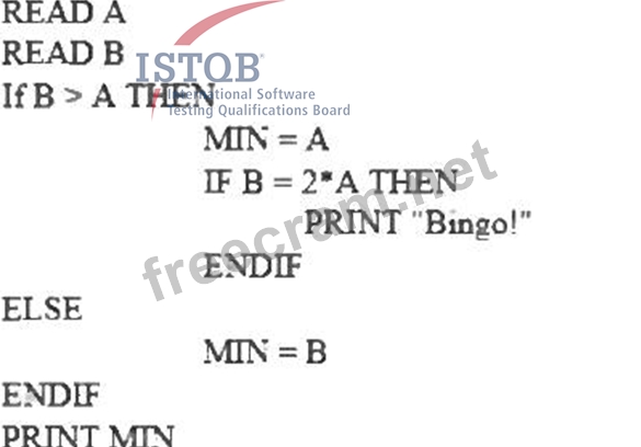 100% statement coverage means that every line of code is executed at least once during testing. Based on the provided pseudo-code and the test cases given: * Test 1 executes the MIN = B statement when A and B are equal. * Test 2 executes the MIN = A statement and skips the inner IF since B is not equal to 2*A. All statements within the code have been executed by these two tests, hence no additional test cases are needed to achieve 100% statement coverage.