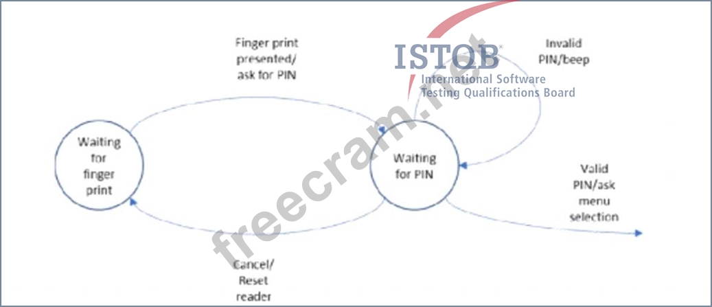 The state transition diagram provided shows three distinct states: * Waiting for fingerprint * Waiting for PIN * Valid PIN/ask menu selection Each state represents a different stage in the system's operation, with transitions based on user actions and system responses.