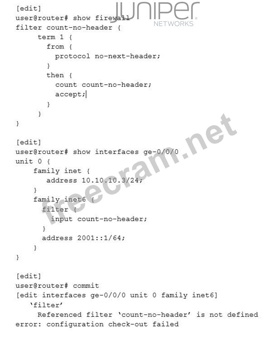You are asked to create a firewall filter to count IPv6 packets that arrive with a no next header value. As shown in the exhibit, you have created and applied the count-no-header firewall filter to the ge-0/0/0 interface. The commit operation fails.