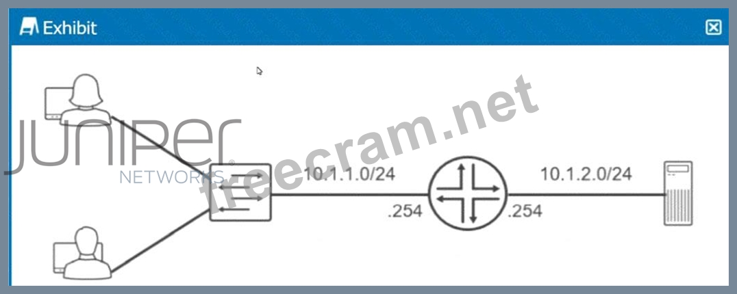 For the users in the 10.1.1.0/24 subnet and the server in the 10.1.2.0/24 subnet to communicate with each other, they need to route packets through the router that connects these two subnets. Each user and the server need to have their default gateway set to the IP address of the router interface on their respective subnet (. 254). This ensures that packets destined for other subnets are sent to the router, which then routes them to the correct destination subnet. References: * Juniper official documentation: Configuring Basic Routing. * General networking principles.