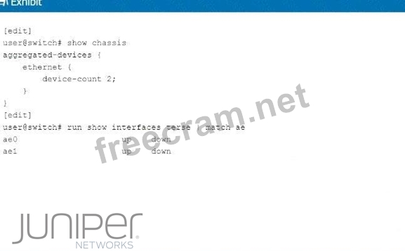 In the exhibit, theae0andae1interfaces are in alink downstate. This occurs when no physical interfaces (member interfaces) have been added to theLAG (Link Aggregation Group)interfaces, or the member interfaces are not operational. Step-by-Step Breakdown: * LAG Configuration:ALAGinterface (aggregated Ethernet interface) is a logical interface that combines multiple physical interfaces for redundancy and increased bandwidth. The LAG will only be operational if at least one member interface is active and configured correctly. * No Operational Member Interfaces:If no member interfaces are added or if the member interfaces are down, the LAG will remain in adownstate, as shown in the exhibit for ae0 and ae1. * Resolution:Verify that physical interfaces have been added to the LAG using commands like: LAG Interface Status: In Juniper, the link status of the LAG depends on its member interfaces, which must be operational for the LAG to function.