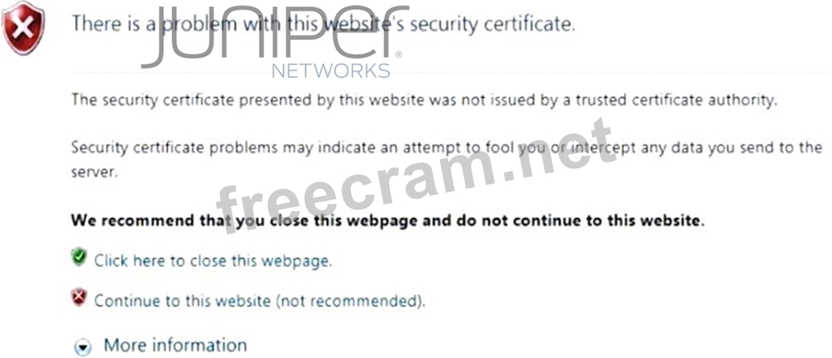 Explanation This is because the error message indicates that the client device does not trust the certificate authority that issued the certificate for the external server. Therefore, you need to import the root CA certificate from the SRX Series device to the client device and add it to the trusted certificate store. This will allow the client device to verify the identity of the SRX Series device and accept the certificates it generates for the external servers3. The other options are not correct because: A). Load a known good, but expired. CA certificate onto the SRX Series device. This will not solve the problem because the client device will still reject the certificates from the SRX Series device if they are signed by an expired CA certificate. The expiration date of the CA certificate is one of the factors that the client device checks when validating the certificate2. B). Install a new SRX Series device to act as the client proxy. This will not solve the problem because the new SRX Series device will still need to have a root CA certificate configured and imported to the client devices. The problem is not with the SRX Series device itself, but with the trust relationship between the SRX Series device and the client devices2. C). Reboot the SRX Series device. This will not solve the problem because rebooting the SRX Series device will not change the configuration or the certificates on the SRX Series device or the client devices. The problem is not caused by a temporary glitch or a malfunction, but by a mismatch between the certificates on the SRX Series device and the client devices2. I hope this helps you understand the problem and the solution better. If you want to learn more about SSL client protection proxy, you can check out the following references: SSL Proxy Overview Configuring SSL Forward Proxy Configuring a Root CA Certificate SSL Proxy - Client Protection