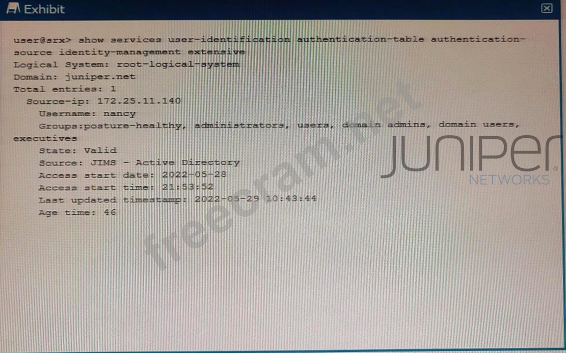 Explanation Based on the exhibit, Nancy logged in to the juniper.net Active Directory domain, as shown by the domain name in the user identity information. The IP address of the authenticating domain controller is 172.25.11.140, as shown by the domain controller address in the user identity information. The IP address of Nancy's client PC is not 172.25.11, but 172.25.11.11, as shown by the source IP address in the user identity information. Nancy is not a member of the Active Directory sales group, but of the marketing group, as shown by the group name in the user identity information34 References: active-directory-access | Junos OS | Juniper Networks 13. Juniper SRX Active Directory Integration - RAYKA Configure Juniper Identity Management Service to Obtain User Identity ... Create an Active Directory Profile | SD Cloud | Juniper Networks
