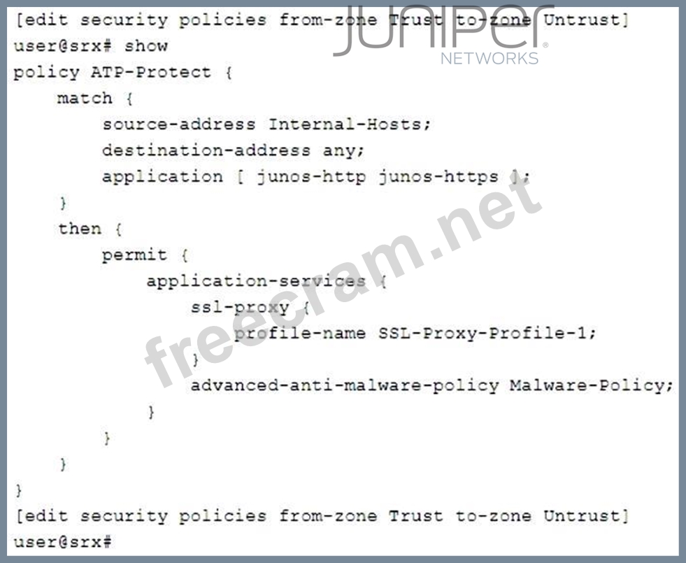 Click the Exhibit button. You are asked to create a security policy that will automatically add infected hosts to the infected hosts feed and block further communication through the SRX Series device.