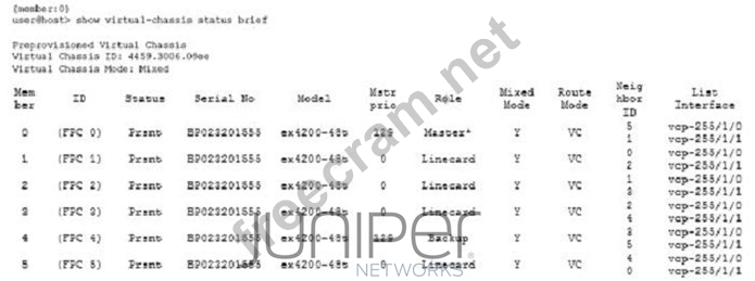 You have an existing Virtual Chassis consisting of five member devices. Member 3 fails and must be replaced. You remove the EX Series switch with a Member ID of 3 and install a replacement switch in its place using identical cabling as shown in the exhibit. The replacement's member ID is 6, so the configuration for member ID 3 is not applied to it.