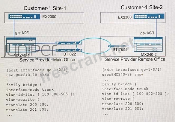 Referring to the exhibit, which two VLAN IDs are egressing the MX Series device towards the optical transport network after translation? (Choose two.)