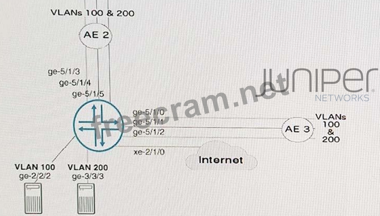 On an MX Series device, you must enable routing between VLANs 100,200, and the Internet ge-5/1/0, and ge-5/1/2 are bundled into interface ae3. Ge-5/1/4, and ge-5/1/5 are bundles into interface ae2. Both AE bundles trunk VLANs 100 and 200.