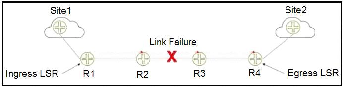 Click the Exhibit button. Referring to the exhibit, you have an established RSVP LSP between R1 and R4 when you experience a link failure between R2 and R3. Which two statements are correct? (Choose two.)