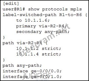 According to the exhibit, the primary LSP is configured with a strict path via R2 to R4. Since the configuration shows valid next-hops and there is no indication of any issues, the primary LSP will be signaled and its state will be up. The secondary LSP with any-path is also configured and will be signaled as a backup; therefore, its state will be up as well, ready to take over if the primary fails. Reference:: MPLS LSP Configuration, Juniper Networks Documentation Configuring Primary and Secondary LSPs, Juniper Networks Documentation