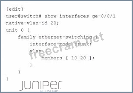 In the exhibit, the interface is configured with the native-vlan-id 20 parameter. This means that any untagged frames arriving on this interface will be associated with VLAN 20. The native VLAN serves as the default VLAN for untagged frames on a trunk port. Reference: Juniper Networks documentation on VLANs: Configuring VLANs