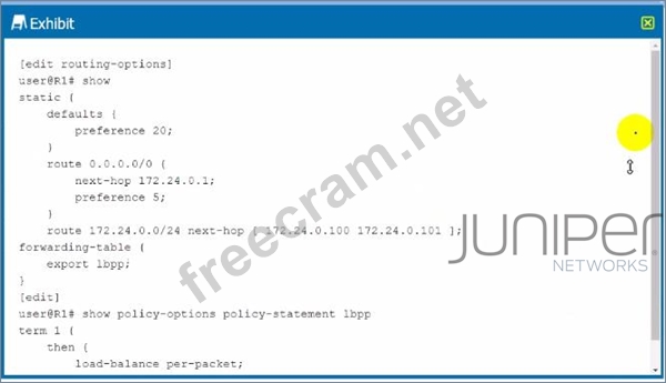 The policy statement shown in the exhibit has a term that specifies load-balance per-packet, which indicates that per-packet load balancing is being used. This means that the routing device will distribute packets out multiple paths on a per-packet basis, rather than on a per-flow (per-destination or per-source-destination pair) basis. Reference: Juniper Networks documentation on Load Balancing: Load Balancing Overview
