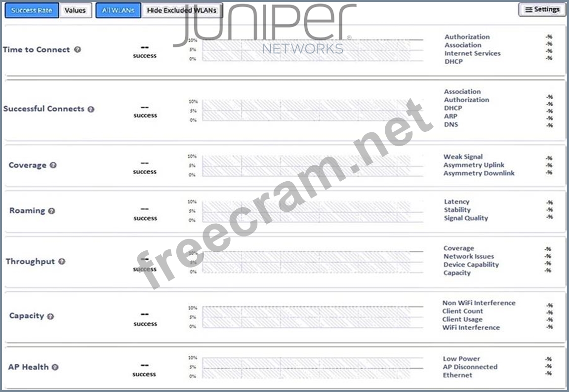 Click the Exhibit button. Users are occasionally having problems connecting to the Internet using Wi-Fi. You suspect possible interference from a neighboring Wi-Fi network. Referring to the exhibit, which Wi-Fi Assurance SLE and classifier would provide information about this issue?