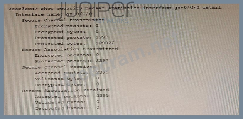 The exhibit shows the output of the show security macsec statistics interface ge-0/0/70 detail command on an SRX Series device. This command displays the statistics for the Media Access Control Security (MACsec) feature on the ge-0/0/70 interface. MACsec is a feature that provides point-to-point security on Ethernet links by using encryption and data integrity checks. MACsec uses two types of keys to secure the traffic: the Connectivity Association Key (CAK) and the Secure Association Key (SAK). The CAK is used for authentication and key exchange between the MACsec peers. The SAK is used for encryption and decryption of the MACsec traffic. The two statements that are true based on the exhibit are: The data that traverses the ge-0/0/70 interface is secured by a secure association key. This is because the exhibit shows that the interface has a Secure Channel (SC) and a Secure Association (SA) established. The SC is a logical connection between the MACsec peers that carries the encrypted traffic. The SA is a subset of the SC that contains the SAK and other parameters for encrypting and decrypting the traffic. The exhibit shows that the interface has encrypted and protected packets, which means that the traffic is secured by the SAK. The data that traverses the ge-0/0/70 interface cannot be intercepted and read by anyone. This is because the exhibit shows that the interface has encryption enabled. The encryption option indicates whether the MACsec traffic is encrypted or not. If encryption is enabled, the traffic is encrypted by the SAK and cannot be viewed by anyone monitoring the link. If encryption is disabled, the traffic is only protected by the SAK and can be viewed by anyone monitoring the link.