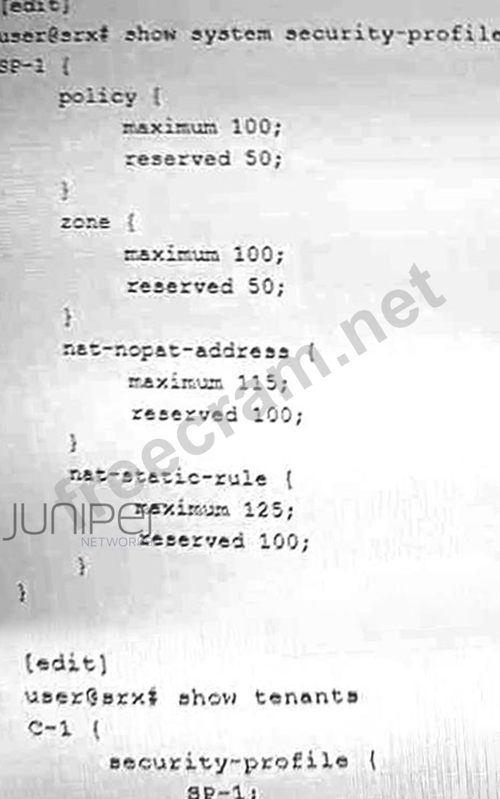 The system security profile named sp-1 has designated resources for policies and zones with a maximum of 100 and a reservation of 50 each. For NAT with no port address translation (nat-nopat- address), there is a maximum of 115 and a reservation of 100, and for static NAT rules (nat-static-rule), there is a maximum of 125 with 100 reserved. When considering tenant systems, the profile applied (sp-1) will dictate the resources available to the tenant system named c-1. The c-1 TSYS has a reservation for the security flow resource. - This would be true if the 'security flow resource' refers to policies and zones since there are reservations made in the profile sp-1. The c-1 TSYS can use security flow resources up to the system maximum. - This is generally true for any tenant system unless there are explicit limits set that are lower than the system maximum.
