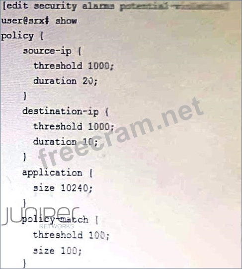 The exhibit shows a security policy configuration with a threshold of 1000 policy violations by a source network identifier and a threshold of 10 policy violations to an application within a specified period. If either of these thresholds are exceeded, an alarm will be generated. Therefore, the correct answer is A and D. The other options are incorrect because: