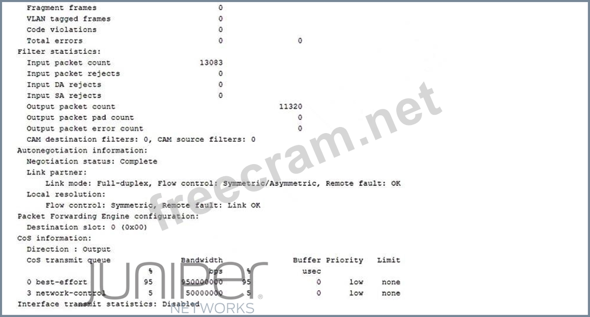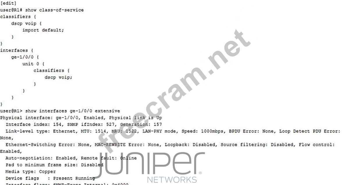 * Understanding the Problem: * The issue involves voice packets being dropped in a newly implemented VoIP network. * Voice packets are marked correctly for the expedited forwarding (EF) queue, indicating that classification is working as intended. * Dropped packets suggest that there may be insufficient resources allocated to handle the traffic in * the EF queue. * Key Concepts: * Classifiers: These are used to mark packets so that they can be placed into the appropriate forwarding class. This step is already correctly implemented as indicated by the problem statement. * Rewrite Rules: These ensure that packets retain their markings as they transit the network, but this is not the issue here as packets are already marked correctly. * Policers: These control the rate of traffic to ensure it does not exceed specified limits, but policing is not required here as the issue is with packet drops due to insufficient resources. * Schedulers: These allocate resources (bandwidth, priority) to different queues to ensure that high-priority traffic (like VoIP) is transmitted with minimal delay and packet loss. * Solution: Configuring a Scheduler: * To prevent the EF queue from being starved of resources and to ensure voice packets are not dropped, you need to configure a scheduler. This scheduler will allocate appropriate bandwidth and priority to the EF queue. * Configuring Scheduler on Juniper Devices: * Here is a sample configuration to allocate bandwidth to the expedited forwarding queue: set class-of-service schedulers voip-scheduler transmit-rate percent 20 set class-of-service schedulers voip-scheduler priority strict-high set class-of-service forwarding-classes queue 1 expedited-forwarding set class-of-service forwarding-classes queue 1 scheduler voip-scheduler * In this configuration: * The voip-scheduler is set to allocate 20% of the bandwidth and is given strict-high priority to ensure voice packets are transmitted with the highest priority. * The EF queue (queue 1) is associated with the voip-scheduler. * Verification: * Ensure the scheduler is applied and active on the interfaces handling the VoIP traffic. * Monitor the interface statistics to ensure that packet drops are minimized and voice quality issues are resolved. References: * Juniper Networks Documentation on Class of Service * Configuring Schedulers