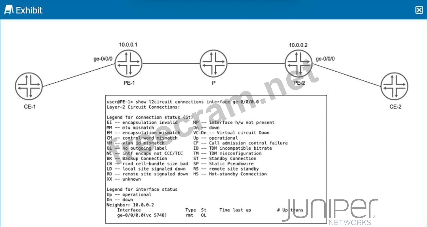 In the provided exhibit, PE-1 and PE-2 are configured with LDP-signaled pseudowires to provide Layer 2 connectivity between CE-1 and CE-2. The issue is that there is no connectivity between CE-1 and CE-2. Let's analyze the potential causes for this fault. 1. **LDP-Signaled Pseudowire (L2 Circuit) Configuration**: - Pseudowires in MPLS networks use LDP (Label Distribution Protocol) to signal the virtual circuit (VC) labels between PE routers. - For successful connectivity, the VC ID (Virtual Circuit Identifier) and LSPs (Label Switched Paths) between the PE routers must be correctly configured and operational. 2. **Analysis of the Exhibit**: - The output shows the status of the L2 circuit connection on PE-1. - The status (St) for the interface is `rmt Dn`, which indicates that the remote site (PE-2) is down or unreachable. 3. **Potential Causes**: - **A. The VC IDs are mismatched**: - Correct. If the VC IDs configured on PE-1 and PE-2 do not match, the L2 circuit cannot be established. Mismatched VC IDs prevent the pseudowire from forming correctly. - **B. There is no LSP configured from PE-1 to PE-2**: - Correct. LSPs are required for MPLS forwarding. If there is no LSP from PE-1 to PE-2, the LDP session cannot establish a path for the pseudowire. This results in the pseudowire being down. - **C. Interface ge-0/0/0 on PE-1 is down**: - Incorrect. The interface status is shown as `Up`, meaning the physical interface is operational. - **D. There is no LSP configured from PE-2 to PE-1**: - While this might seem like a potential issue, the specific problem of the remote site being down (`rmt Dn`) typically relates more directly to the forward path from PE-1 to PE-2 (i.e., no LSP from PE-1 to PE-2). Hence, the more accurate immediate cause is covered in Option B. **Conclusion**: Given the analysis, the correct statements describing potential causes for the fault are: **A. The VC IDs are mismatched.** **B. There is no LSP configured from PE-1 to PE-2.** **References**: - Juniper Networks Documentation on L2 Circuits: [Configuring Layer 2 Circuits](https://www.juniper.net/documentation/en_US/junos/topics/task/configuration/layer-2-circuits-configur - MPLS Configuration Guide: [Juniper MPLS Configuration](https://www.juniper.net/documentation/en_US/junos/topics/topic-map/mpls-overview.html)