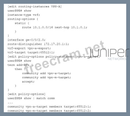 The exhibit shows the configuration of a VRF (Virtual Routing and Forwarding) instance on a Juniper PE router. Let's break down the key components: * VRF Configuration (VPN-A) * The instance type is VRF, meaning this is an L3VPN (Layer 3 VPN). * The routing instance contains a static route (10.1.0.0/16 next-hop 10.1.0.1). * The interface ge-0/0/2.0 is assigned to the VRF. * Route Distinguisher (RD): 172.17.20.1:1 * VRF-Export Policy: vpn-a-export * VRF-Target: target:65512:1 (This defines which routes will be imported into the VRF). * VRF Export Policy (vpn-a-export) * The vpn-a-export policy adds two BGP communities (route targets) to exported VPN routes: community add vpn-a-target; community add vpn-m-target; accept; * The vpn-a-target community corresponds to target:65512:1. * The vpn-m-target community corresponds to target:65512:2. * Policy-Options (Community Definitions) community vpn-a-target members target:65512:1; community vpn-m-target members target:65512:2; * This confirms that routes exported from this VRF will have BOTH target:65512:1 and target: 65512:2. Evaluating the Answer Choices # Option A: "VPN routes are exported with the target:65512:1 and target:65512:2 route targets." * The vpn-a-export policy explicitly adds both vpn-a-target (65512:1) and vpn-m-target (65512:2) to exported routes. * This is correct. # # Option B: "You cannot use the vrf-target and vrf-export statements in the same VRF." * This is incorrect. * Juniper allows the use of both vrf-target and vrf-export in the same VRF: * vrf-target is used for importing routes. * vrf-export defines export policies (which can add additional route targets). * This is incorrect. # # Option C: "VPN routes with the target:65512:1 and target:65512:2 route targets are imported." * The vrf-target target:65512:1; statement only controls importing routes. * The import policy does not include target:65512:2, so routes tagged with target:65512:2 alone would not be imported into this VRF. * This is incorrect. # # Option D: "VPN routes are exported with only the target:65512:1 route target." * The export policy (vpn-a-export) clearly adds both 65512:1 and 65512:2. * This is incorrect. # # A. VPN routes are exported with the target:65512:1 and target:65512:2 route targets. Verification from Juniper Documentation * Juniper MPLS L3VPN Configuration Guide confirms that vrf-target is used for importing, while vrf-export can be used for exporting multiple route targets. * Juniper Routing Policy Documentation states that export policies can add multiple BGP communities (route targets). * RFC 4364 (BGP/MPLS IP VPNs) defines the use of route targets for VPN route control.
