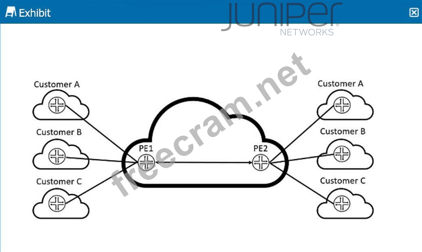 Understanding the Exhibit and the Problem Statement * The diagram shows a Layer 3 VPN (L3VPN) setup where multiple customers (Customer A, B, and C ) are connected across a service provider network using PE (Provider Edge) routers. * PE1 and PE2 exchange VPN routes for all customers using BGP/MPLS Layer 3 VPN (L3VPN) routing. * The question asks how to verify if PE2 is receiving VPN routes for Customer C. Evaluating the Answer Choices # B. show route table bgp.l3vpn.0 (Correct Answer) * Why? * This command shows all VPN routes stored in the BGP Layer 3 VPN table (bgp.l3vpn.0). * Since PE routers exchange VPN routes using MP-BGP, this table contains the VPN-IPv4 or VPN-IPv6 routes for all customers. * If PE2 is receiving routes from PE1 for Customer C, they will appear in bgp.l3vpn.0. # A. show route table inet.0 (Incorrect) * Why? * The inet.0 table contains global unicast routes for the service provider's network. * VPN routes do not appear here because they are stored in VRF-specific tables. * This command won't help verify VPN route exchange between PE1 and PE2. # C. show route table customer-c.inet.0 (Incorrect) * Why? * The table customer-c.inet.0 represents the VRF routing table for Customer C on the local PE. * It only shows locally installed routes for Customer C but does not confirm if PE2 is receiving routes from PE1. * This command is useful to check local VPN routing but not BGP route propagation. # D. show route summary (Incorrect) * Why? * This command only provides a summary of route counts per protocol (BGP, OSPF, etc.). * It does not display specific VPN routes. * It is useful for general troubleshooting but doesn't confirm VPN route receipt. # show route table bgp.l3vpn.0 (Option B) Official Juniper Documentation Reference * Junos MPLS VPNs Configuration Guide# Juniper Documentation "The show route table bgp.l3vpn.0 command displays all VPN-IPv4 routes learned via MP-BGP for Layer 3 VPNs."