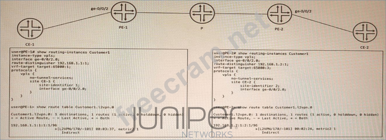 CE-1 and CE-2 are part of a VPLS called Customer1 No connectivity exists between CE-1 and CE-2. In the process of troubleshooting, you notice PE-1 is not learning any routes for this VPLS from PE-2, and PE-2 is not learning any routes for this VPLS from PE-1.