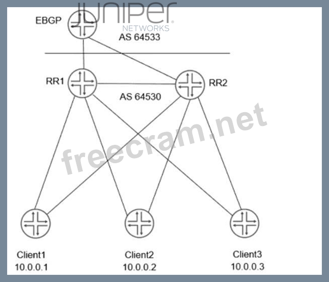 Referring to the exhibit, which two statements are correct about the dual route reflectors within a cluster?