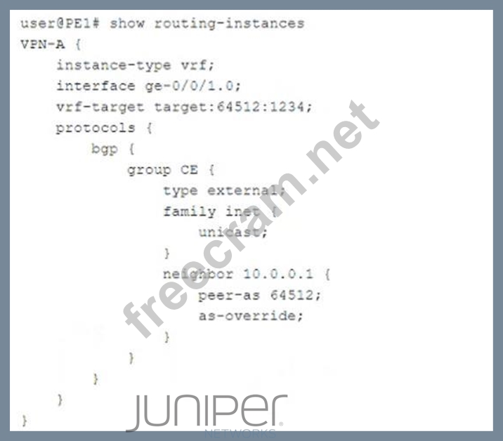 The provided configuration is for a routing instance named VPN-A on a Juniper PE (Provider Edge) router. Let's break it down: * Instance Type: VRF * The instance-type vrf; statement indicates that this is a Layer 3 VPN (L3VPN) using MPLS VPNs (RFC 4364 - BGP/MPLS IP VPNs). * This confirms that Option D (A Layer 3 VPN is configured) is correct #. * VRF Target and Interface Association * The vrf-target target:64512:1234; defines the route target (RT) for importing and exporting VPN routes. * The interface ge-0/0/1.0; binds this interface to the VRF. * BGP Configuration for CE (Customer Edge) Peering * The group CE section configures external BGP (EBGP) (type external;). * The neighbor 10.0.0.1 is in AS 64512 (peer-as 64512;). * The as-override; statement is used. Evaluating the Answer Choices # Option B: "This VPN connects customer sites that use the same AS number." * The as-override; command allows multiple customer sites that use the same AS number (64512) to communicate over the service provider's MPLS network. * Normally, BGP prevents routes with the same AS in the AS_PATH from being accepted. The as- override feature replaces the customer's AS number with the provider's AS, ensuring proper route advertisement. # This statement is correct. # Option A: "This VPN connects customer sites that use different AS numbers." * If the customer sites had different AS numbers, there would be no need for as-override. * The as-override feature is specifically used when all customer sites share the same AS number, ensuring that BGP routes are accepted. # This statement is incorrect. # Option C: "A Layer 2 VPN is configured." * A Layer 2 VPN (L2VPN) configuration would typically use instance-type l2vpn; or EVPN/VPLS- related parameters (e.g., protocols l2vpn or protocols vpls). * Since this configuration uses instance-type vrf; and BGP with a VRF target, it is clearly a Layer 3 VPN (L3VPN). # This statement is incorrect. # Option D: "A Layer 3 VPN is configured." * The instance-type vrf; confirms this is an MPLS Layer 3 VPN (L3VPN). * VRFs, BGP, and route targets (vrf-target) are specific to Layer 3 VPNs. # This statement is correct. # B. This VPN connects customer sites that use the same AS number. # D. A Layer 3 VPN is configured. Verification from Juniper Documentation: * Juniper BGP/MPLS Layer 3 VPNs Guide confirms that instance-type vrf is used for L3VPNs. * Juniper BGP Configuration Guide states that as-override is applied when customer sites use the same AS number. * RFC 4364 (BGP/MPLS IP VPNs) explains how route targets and VRFs are used in L3VPN deployments.